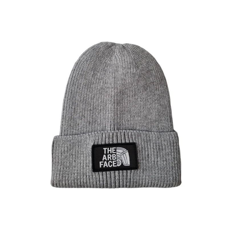 Arb Fictions grey cotton beanie with The Arb Face logo stitched onto the front.