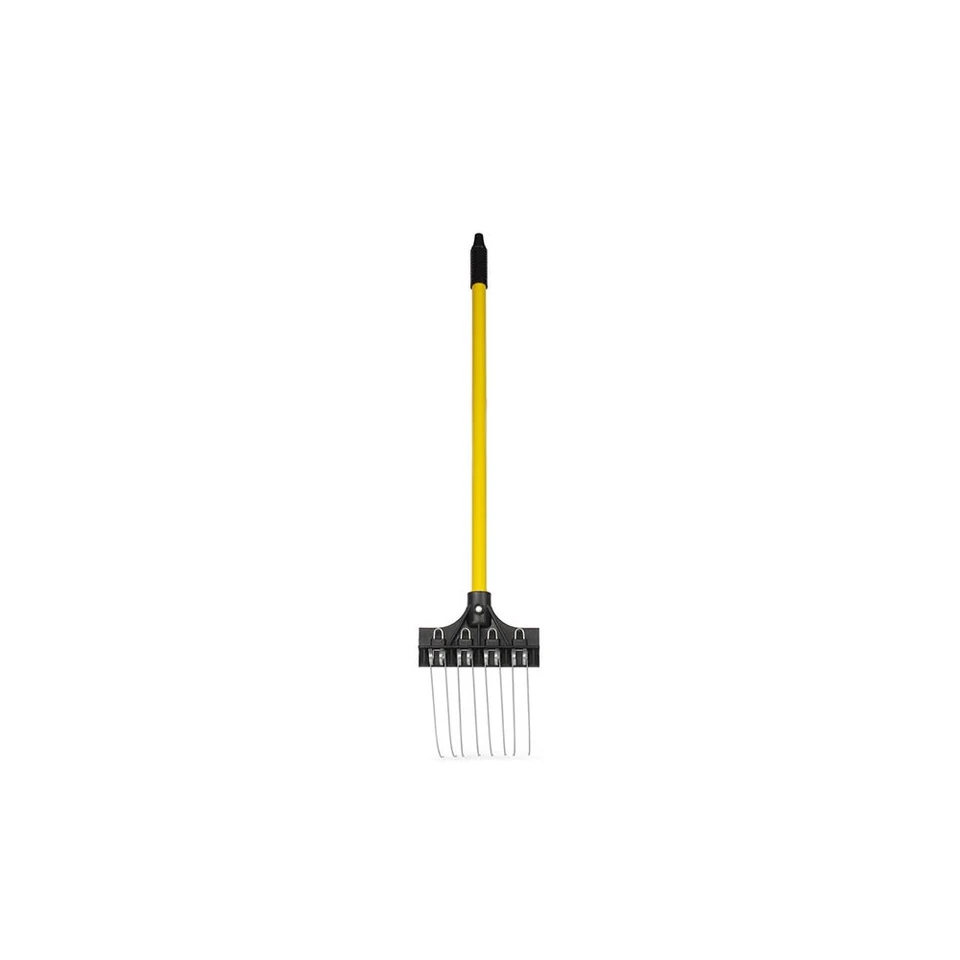 The swivel hanger at the end of the rake makes it easy to hang on any hook out of the way when not in use. The aggressive angle to which the tines are formed makes the rake dig right in without the need for pushing down on it – thus allowing “no down pressure”; permitting you to stand straight up while using the rake and makes it much easier on your back. With the pressure off your back this rake allows you to work longer and accomplish more with less effort than you need to exert with other rakes. This feature allows you to work effectively with any number of different materials and get very effective results.