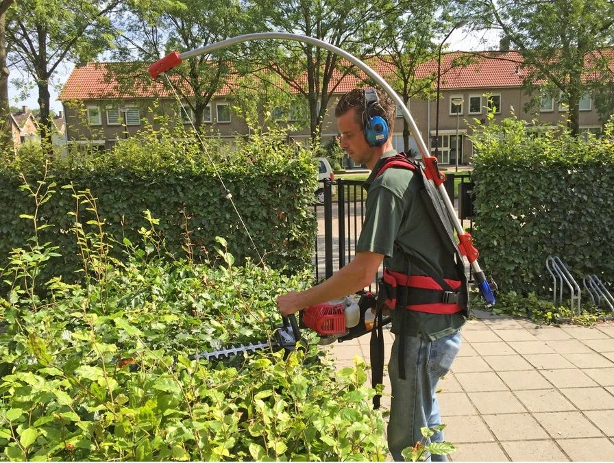 The comfortable harness with adjustable shoulder straps is worn as a backpack. You connect your hedge trimmer (or other portable garden tools> 4.5 kg) to the steel cable of the pulley, which transfers the weight of the shears to the harness. The cable moves smoothly along roller bearings in the adjustable tube. This way the ET helps you shave hedges all day long. And because it is less strenuous, you also work faster and safer.