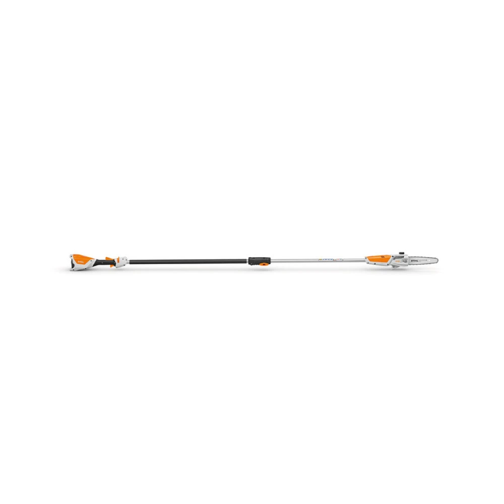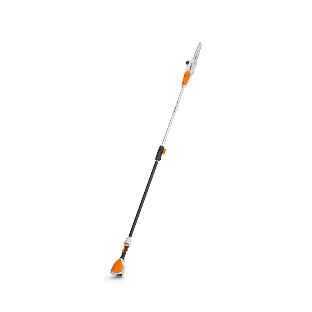 Lightweight cordless pole pruner with high cutting performance for tree maintenance work in medium-sized to large gardens. Part of the AK System and fitted with 1⁄4″ P – PM3 saw chain and Rollomatic E Mini guide bar. The HTA 50 has side-mounted chain tensioning and a branch hook for easy removal of cuttings from the tree canopy (for use on small branches only).